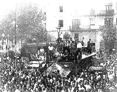 | Momentos de euforia entre los trabajadores en la Rambla del Poblenou (Paseo del Triunfo) por la derrota de los fascistas. |